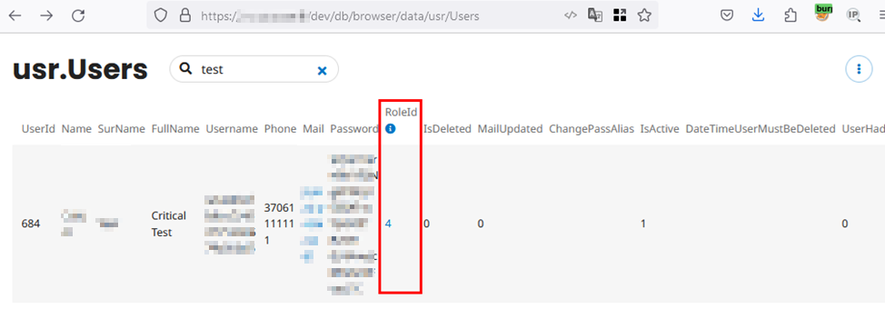To demonstrate this vulnerability, we can review the current state of the data for user 684. The illustration below shows the data for user 684, where the value of the RoleId attribute is set to 4, indicating that the user is a regular website user.