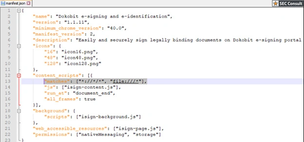 With the Dokobit Firefox browser extension, letās look at theĀ manifest.jsonĀ configuration file from the extension package to see the problem: