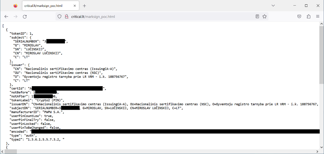 It is probable that the example code is hosted somewhere on the web or embedded in a legitimate web page using, for instance, a stored cross-site scripting vulnerability, or fully compromising the target website. For it to work, the user of the vulnerable e-signing software has to access this website containing the malicious code which then would extract the certificate data, and in case of Lithuanian citizen data contains an unchangeable person-code given at birth (SERIALNUMBER in the screenshot) in a covert way: